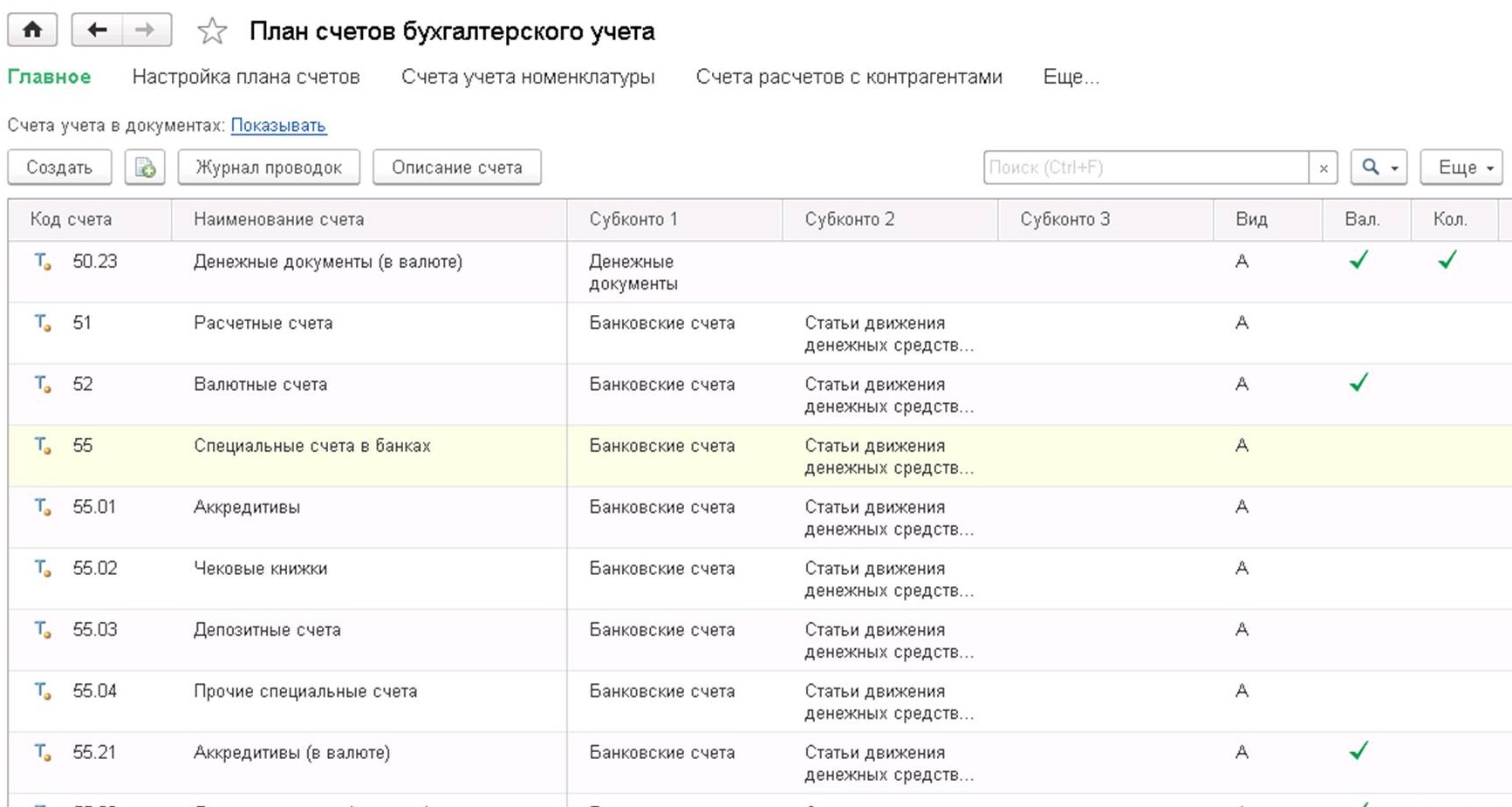 Поскольку в регламентированной отчетности валютные операции должны попасть в форму №4, необходимо чтобы данная статистика присутствовала в учете. Для этого выполняем следующие настройки – заходим в «План счетов»: