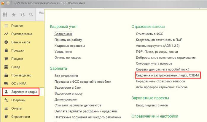 Найти отчеты для ПФР можно в разделе "Зарплата и кадры".