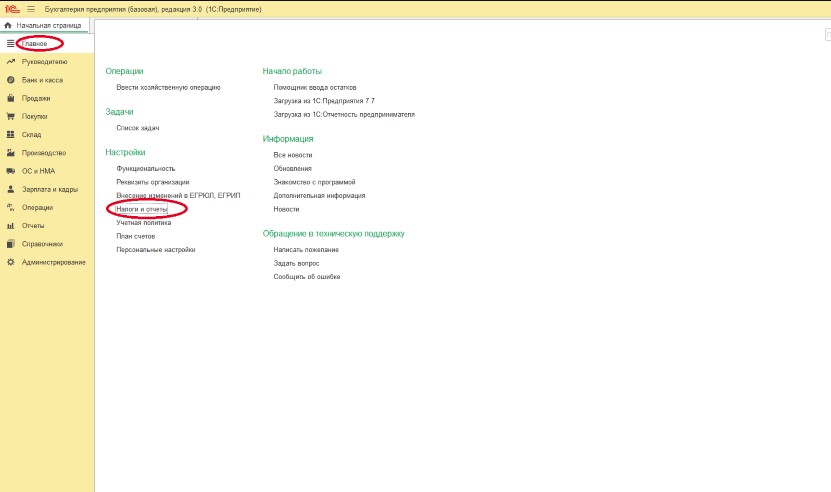 Чтобы изменить настройки режима налогообложения, перейдите в меню Главное, подраздел Настройки — Налоги и отчеты: