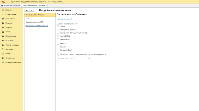 Как изменить режим налогообложения в 1С