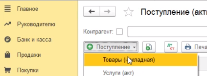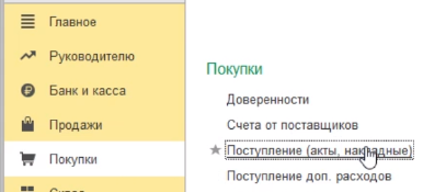 Теперь мы хотим сделать так, чтобы в документах поступления автоматически проставлялась именно эта цена для этой номенклатуры. Делаем документ поступление. Нажимаем покупки, поступление (акты, накладные).