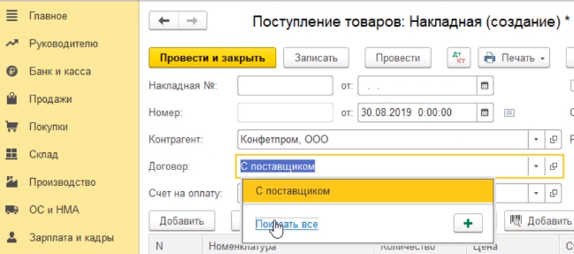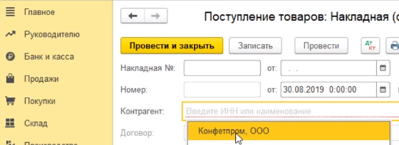 Выбираем контрагента, в нашем случае ООО "Конфетпром".