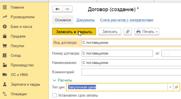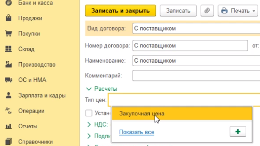 В этом договоре выбираем именно этот тип цены, который мы только что создали и для которого мы установили цену номенклатуры.