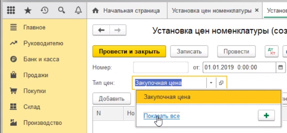 Если же у нас типов цен несколько, то для выбора нужной нам цены необходимо нажать кнопку показать все.