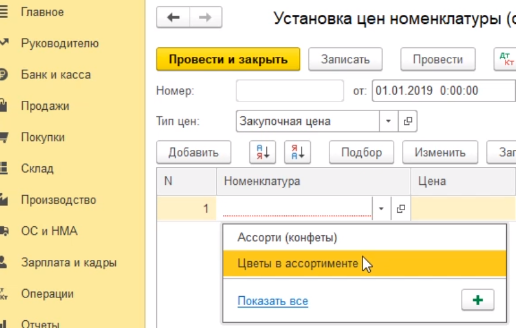 Выбираем нашу номенклатуру. как видим, программа по умолчанию подтянула цену.