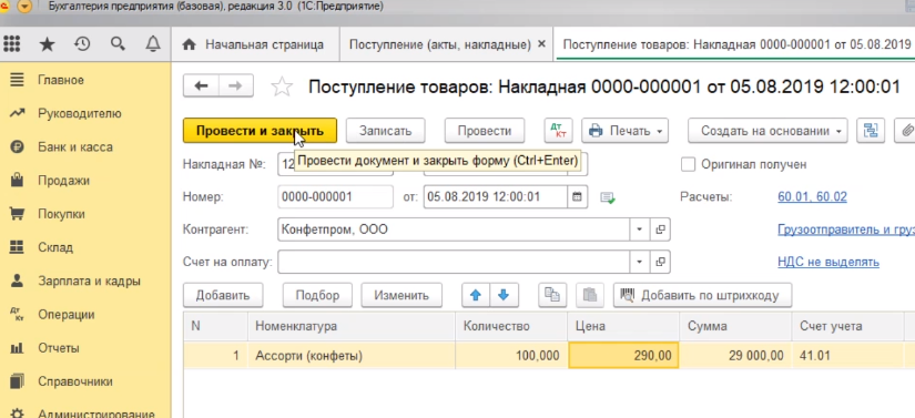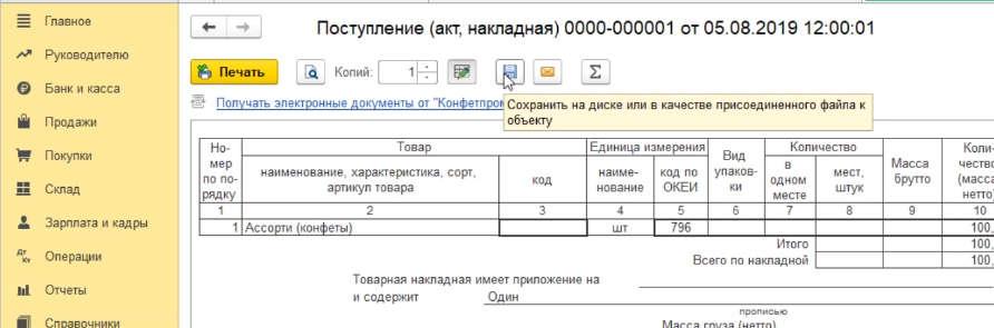 Программа проведет документ и закроет нашу форму для заполнения. Если же мы хотим распечатать этот документ, то мы должны провести его без закрытия формы - нажимаем на кнопку провести. Программа провела документ.