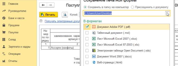 При нажатии на нее программа предлагает выбрать вариант формата, в котором мы хотим сделать сохранение. Это может быть и вордовский вариант, экселевский, в нашем случае мы выбрали пдф формат.