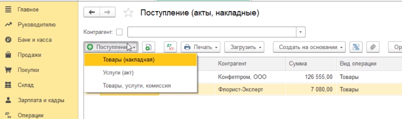Для этого идем в раздел покупки / Поступление (акты, накладные).