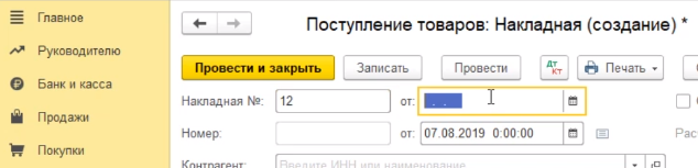 Заполняем реквизиты документа - номер докладной и дату накладной мы соответственно берем с вами из документов, полученных от поставщика. Это номер накладной в печатной форме и соответственно дата этого документа в печатной форме.