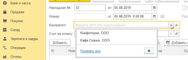 Далее указываем непосредственно нашего контрагента поставщика через кнопочку выбрать, показать все и выбираем поставщика ООО "Конфетпром".