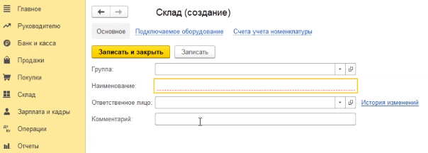 Открывается форма для заполнения, где мы с вами должны указать наименование этого склада и ответственное лицо на складе.