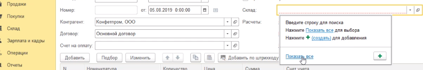 Выбрали склад и далее заполняем табличную часть нашего документа.