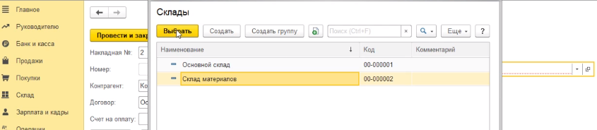 Выбираем тот склад, на который мы хотим поступающие товары или материалы соответственно оприходовать.