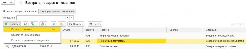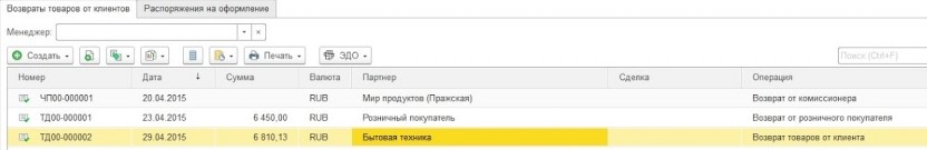 Конфигурация «Управление торговлей» содержит 3 вида совершаемых операций с помощью которых возможно произвести возврат продукции: