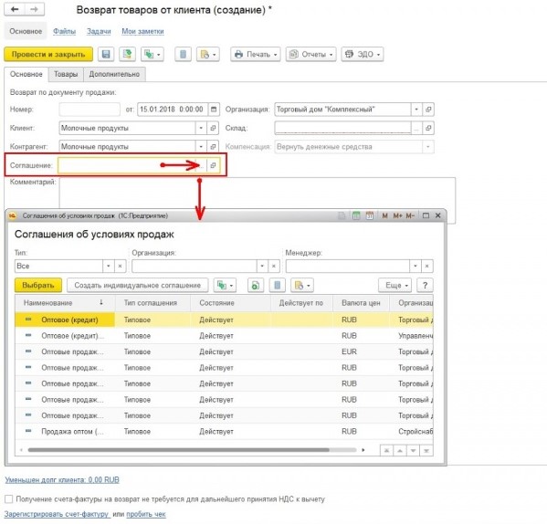 Соглашение – вам следует выбрать контракт при их применении. В процессе выбора предприятия и потребителя, совокупность контрактов будет доступен для выбора в раскрывающемся списке: