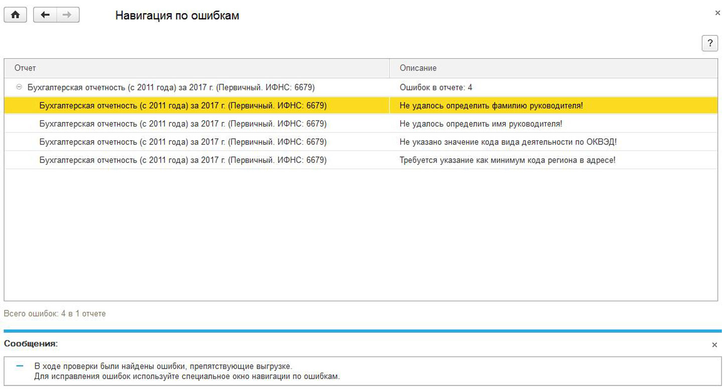 Результаты данной проверки отобразятся в отдельном окне, где будут указаны все допущенные ошибки, требующие исправлений. В этом окне в левом поле указано наименование отчета, а в правом описание ошибки.