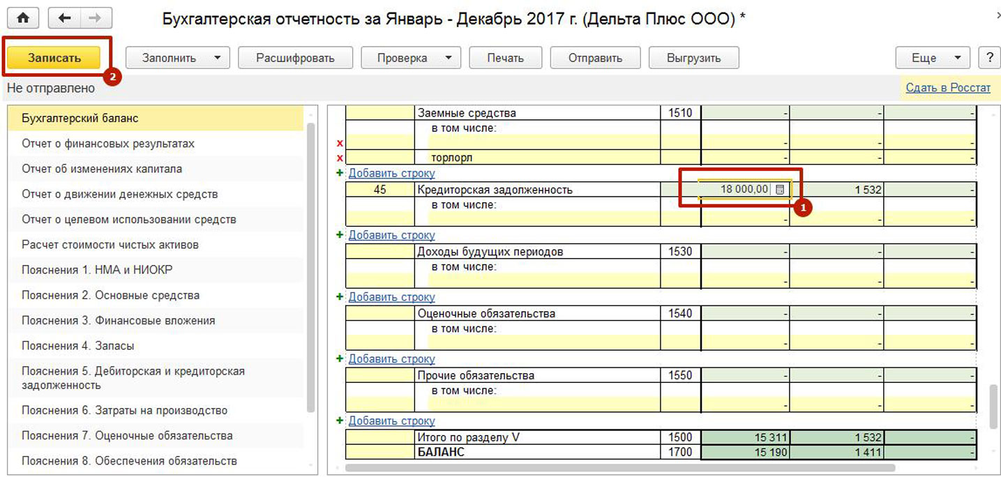 Рекомендуется на всем протяжении процесса создания отчета (при формировании баланса и его корректировке) постоянно сохранять данные нажимая на кнопку «Записать». В противном случае пользователь рискует потерять уже сделанные изменения.