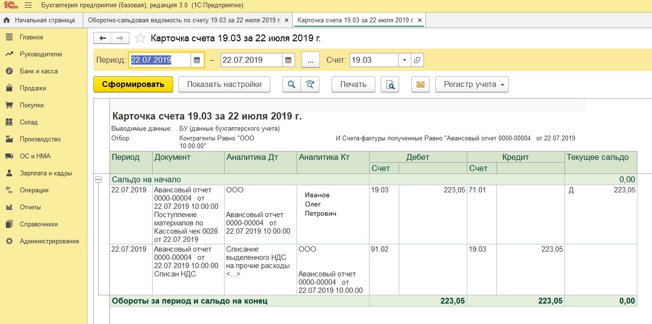 Для проверки списания НДС формируется оборотно-сальдовая ведомость по счету 19.03