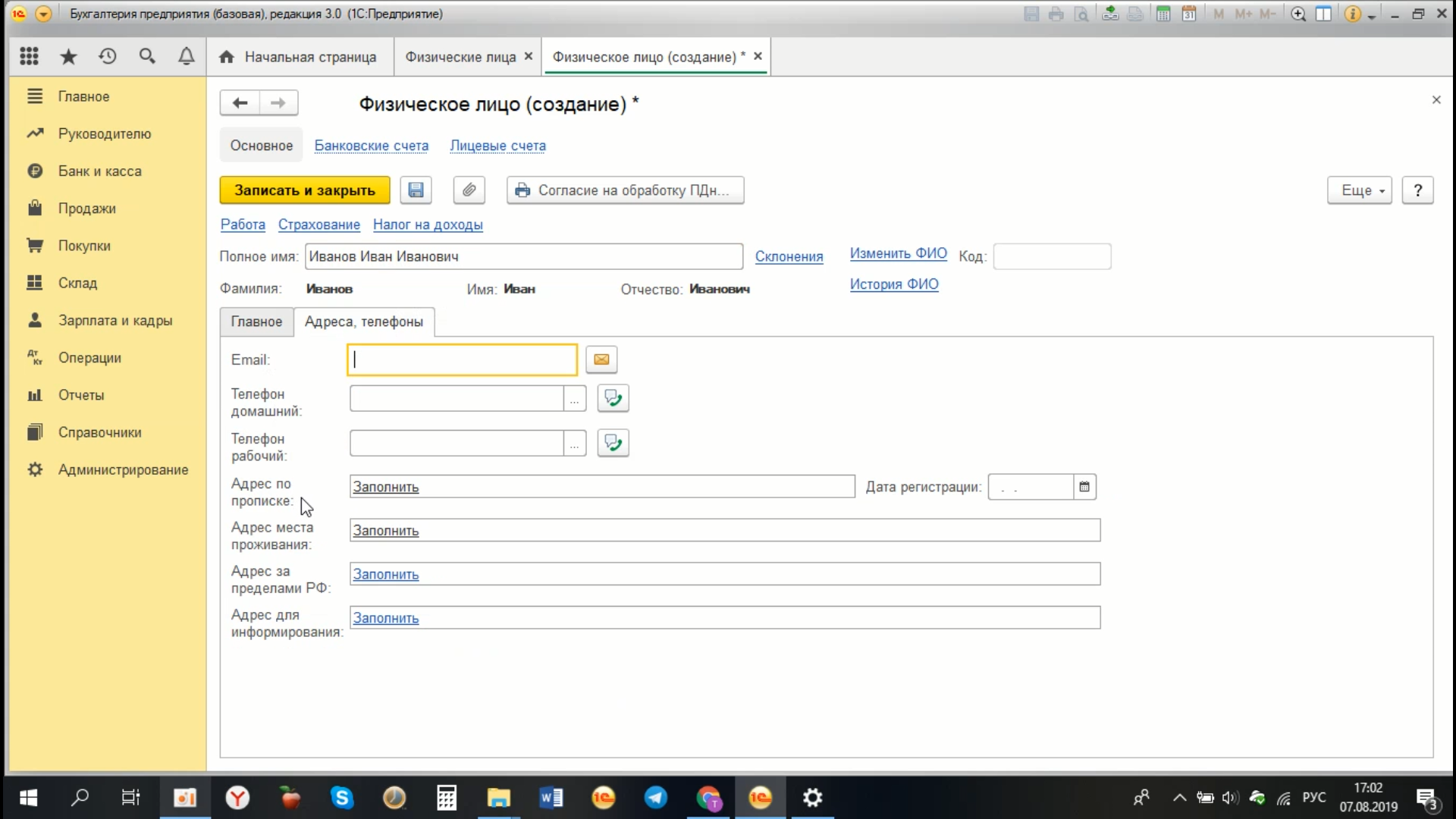 После того как мы все эти данные, всю информацию занесли, мы записываем наш элемент. У нас в справочнике «Физические лица» появился Иванов Иван Иванович.