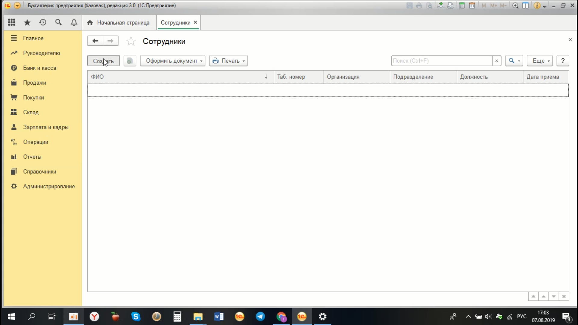 После чего, мы переходим к созданию нового элемента в справочнике «Сотрудники». Заходим в «Зарплата и кадры», справочник «Сотрудники».
