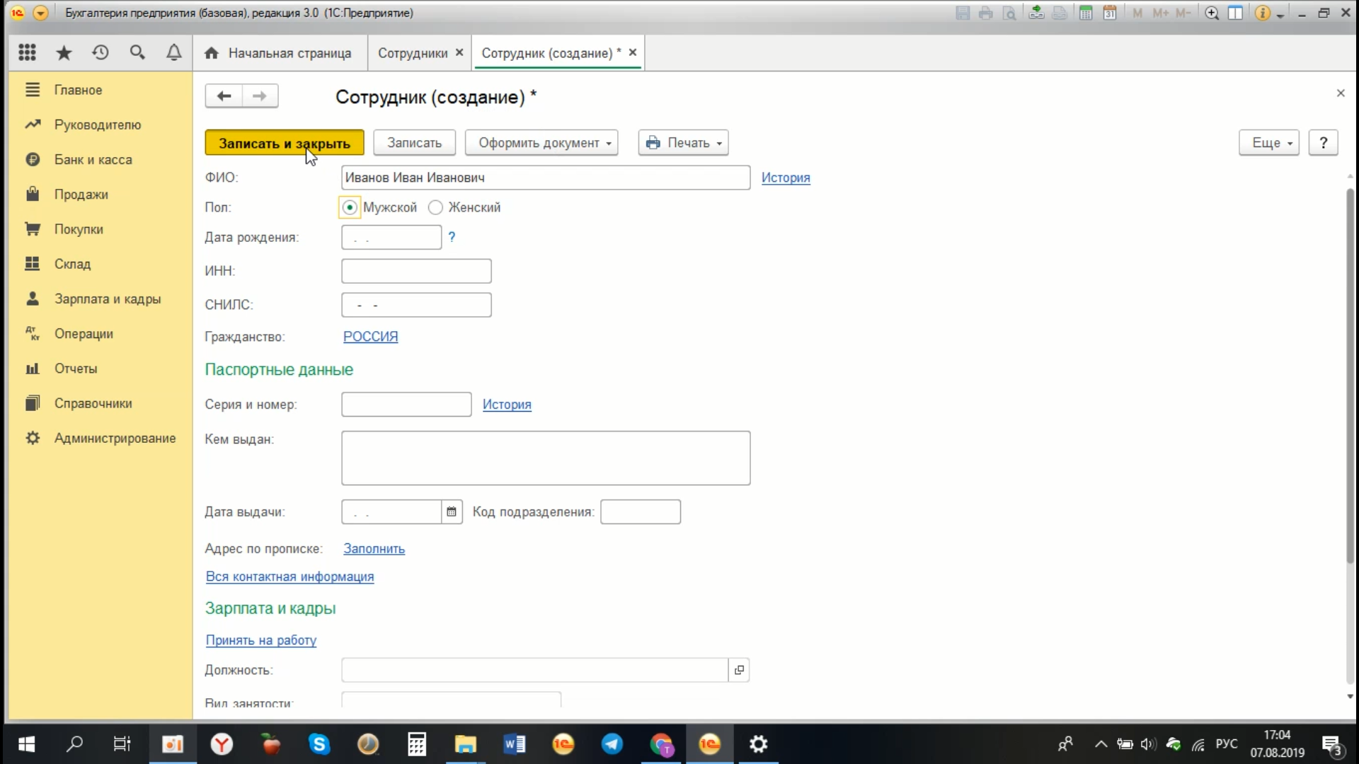 И тогда программа нам, соответственно, подтягивает к нашему сотруднику все необходимые данные, которые заполняются для него (Иванова Ивана Ивановича), как для физического лица. После чего, мы можем эту карточку сотрудника «Записать и закрыть».