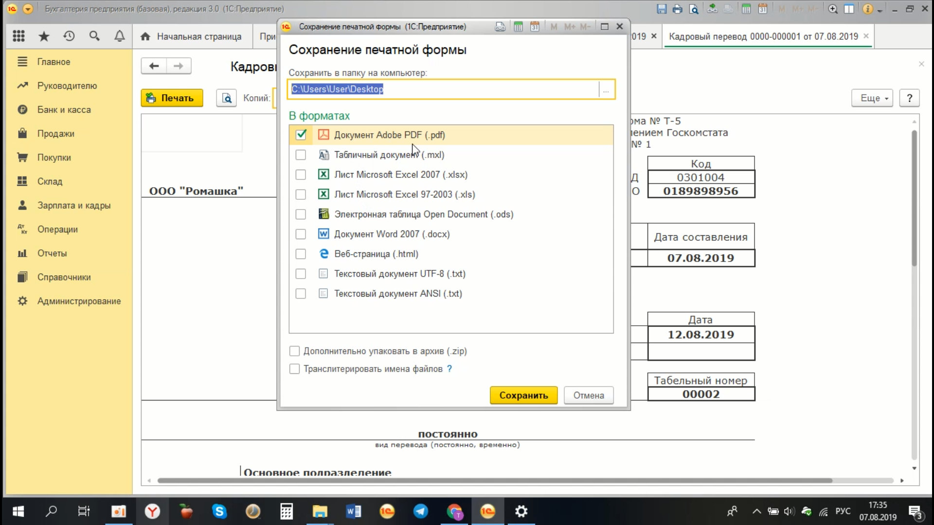 А далее, соответственно, у нас есть возможность, либо его распечатать непосредственно из самого документа. Либо сохранить в электронном виде с помощью кнопки «Сохранить на диск» в нужном формате, либо это будет документ Word, либо таблица Excel, либо, как у нас документ в PDF формате и выбираем, соответственно, место на диске, куда мы его будем сохранять, в нашем случае - это Рабочий стол, сохраняем.