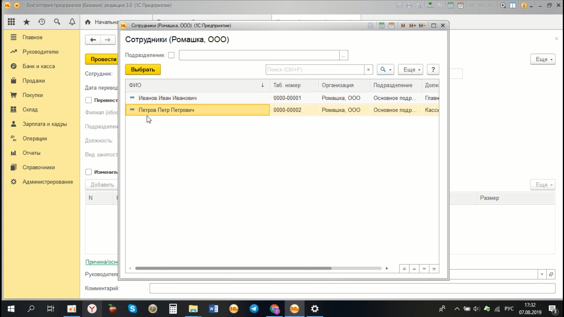 Открывается форма для заполнения. В документе «Кадровый перевод», мы указываем сотрудника, которого мы переводим в новое подразделение, например в нашем случае - это Петров Петр Петрович.
