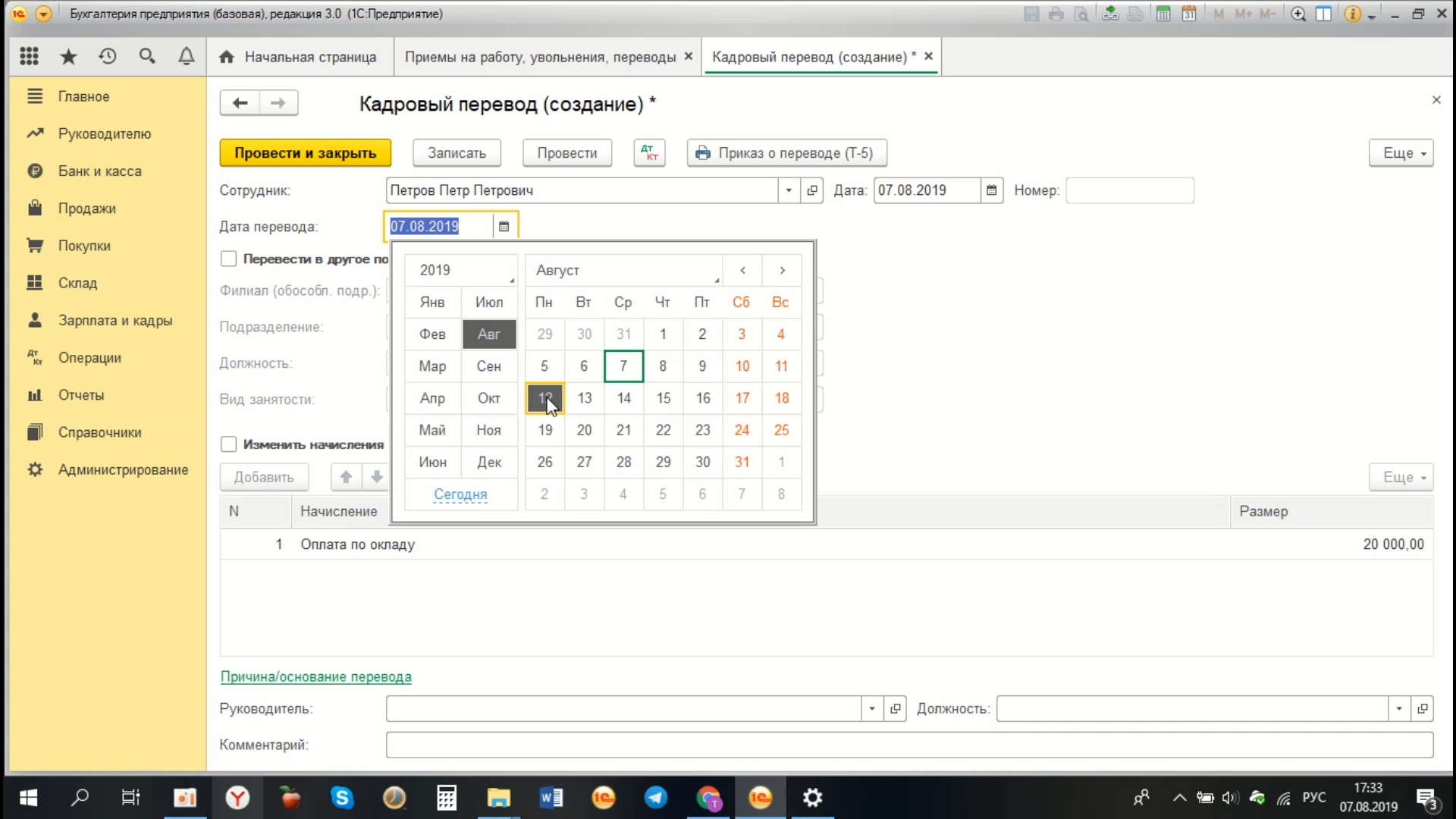 Указываем дату, с которой он будет переведен на новую должность, предположим, с 12 августа. Дата документа – это дата текущая, дата, с которой будет оформляться этот приказ на перевод.