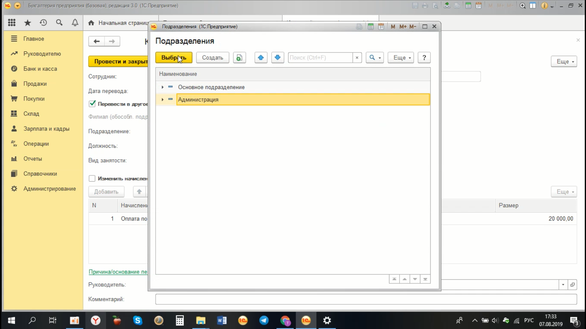 Если мы его переводим в другое подразделение, то мы по ссылке «Показать все» выбираем другое подразделение, в которое мы его хотим перевести. И, соответственно, с 12 августа, при проведении документа, он у нас будет уже сотрудником подразделения «Администрация».