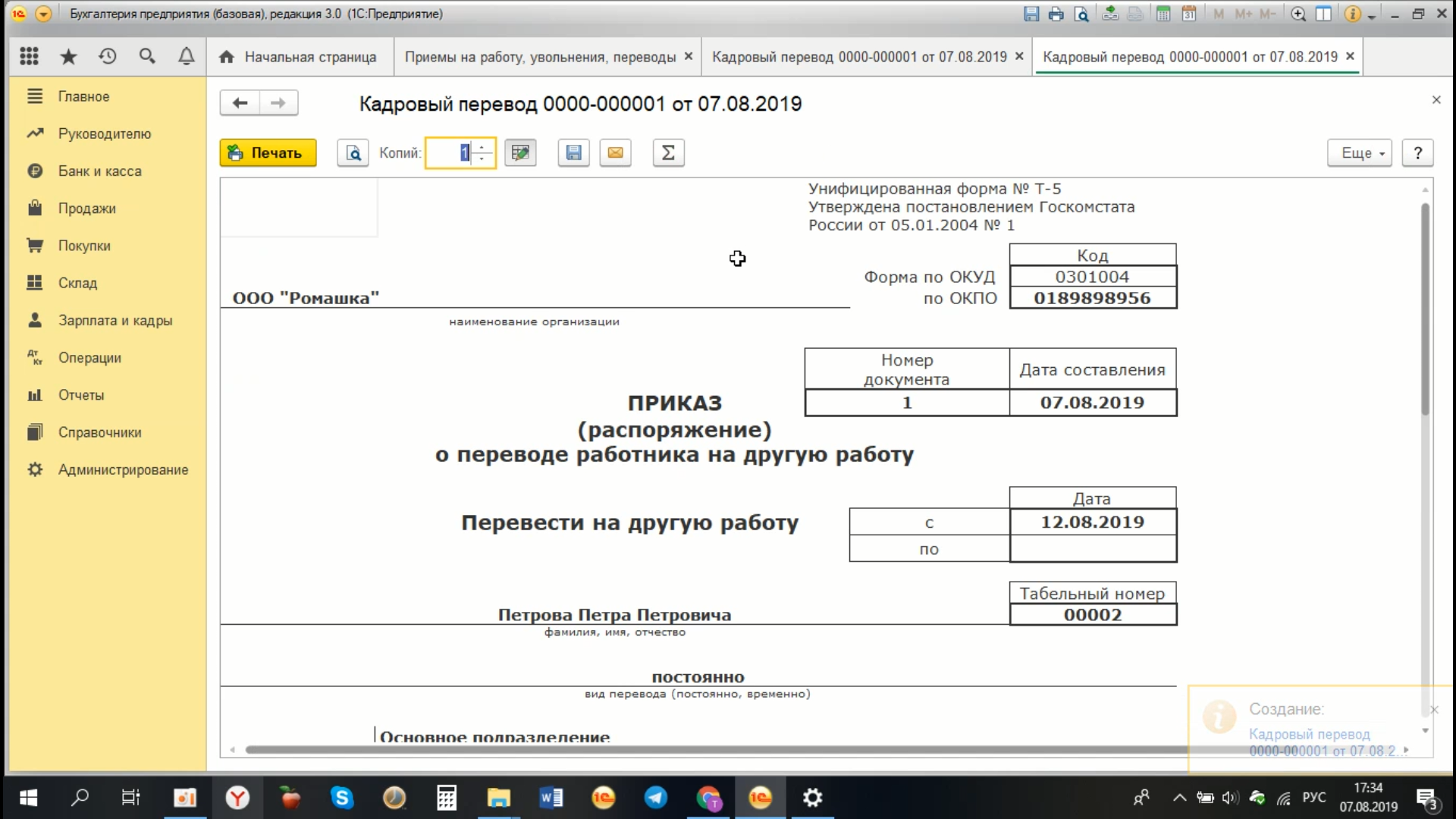 После чего можем вывести этот приказ на экранную форму с помощью кнопки «Приказ о переводе Т-5».