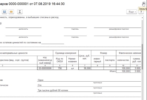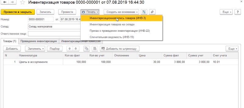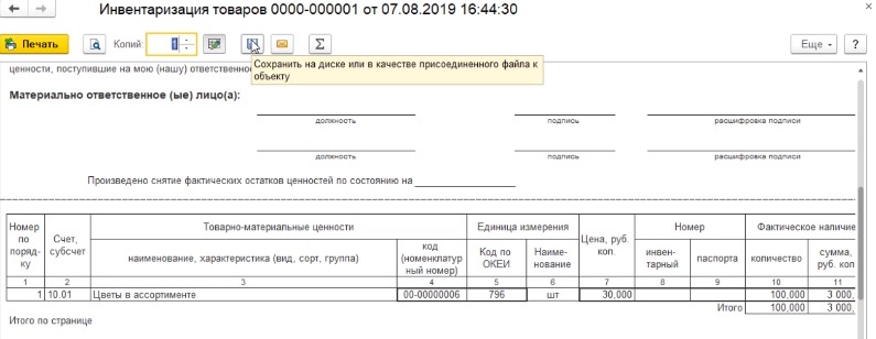 Документ инвентаризации готов. Можно вывести его на печать через кнопку печать, инвентаризационная опись товаров