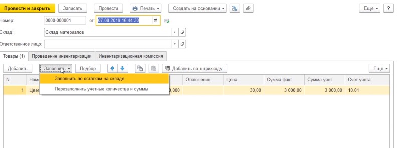 Далее по кнопочке заполнить в табличной части, просим программу заполнить табличную часть данными по учету товаров на складах (заполнить по остаткам на складах)