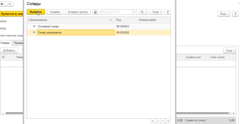 Можем посмотреть все склады. В нашем случае нас интересует склад материалов. Выбираем этот склад