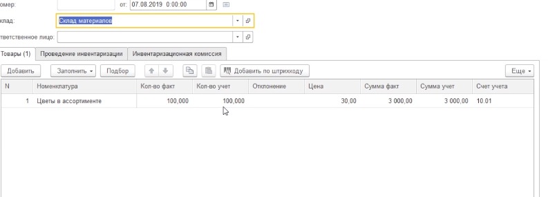 Программа видит и нам выдает информацию, что конкретно по складу материалов на седьмое августа имеется номенклатура - цветы в ассортименте в количестве сто штук. По учету тоже сто штук, цена, сумма и счет учета. Всю информацию программа нам соответствующим образом выдала
