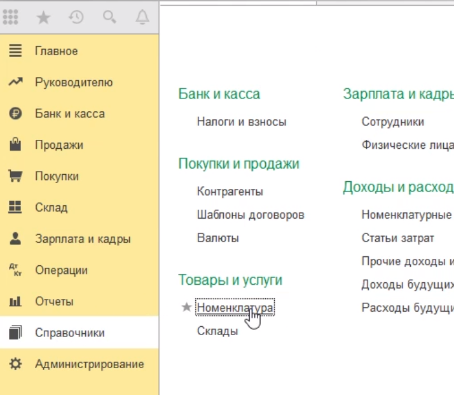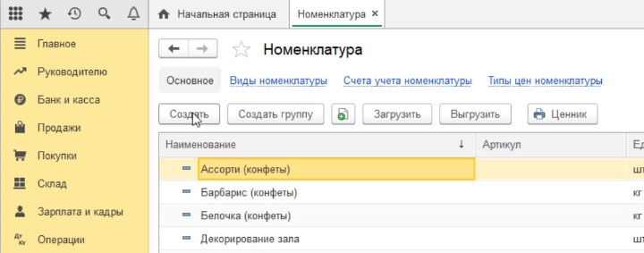 Здесь справочники для создания нового элемента номенклатуры. Нажимаем кнопочку создать.