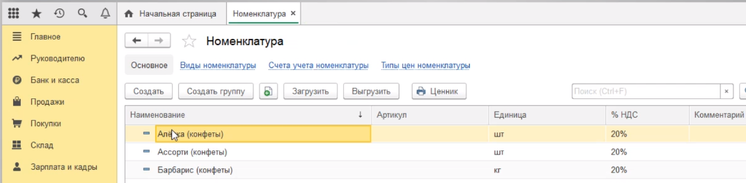 От вида зависит какие счета учета номенклатуры по умолчанию программа будет подставлять в документы. Далее заполняем наименование нашего товара. Например, конфеты Аленка.