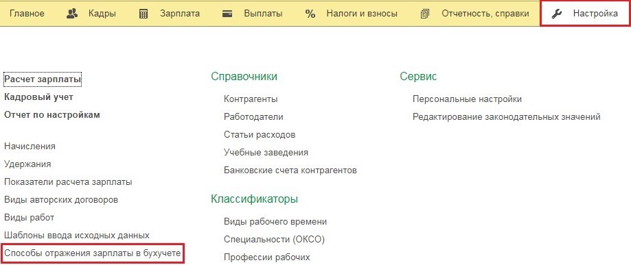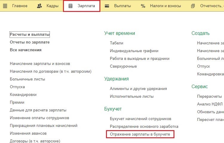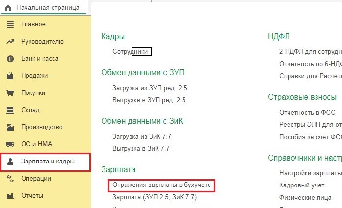 Это делается в разделе «Зарплата и кадры». Нам понадобится пункт «Отражения зарплаты в бухучете».