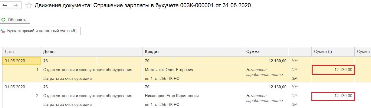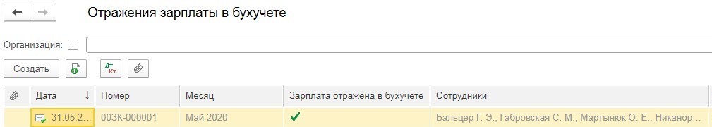Когда будут внесены все изменения, нужно будет провести документ «Отражение зарплаты в бухучете». После чего проверить проводки.