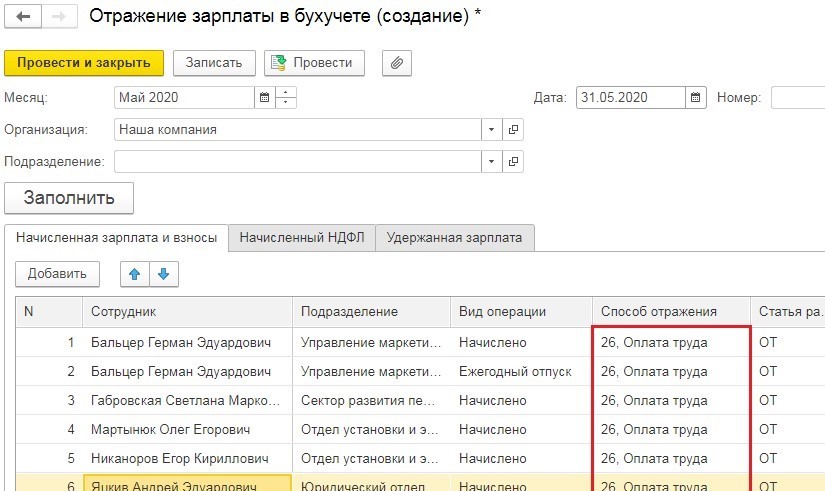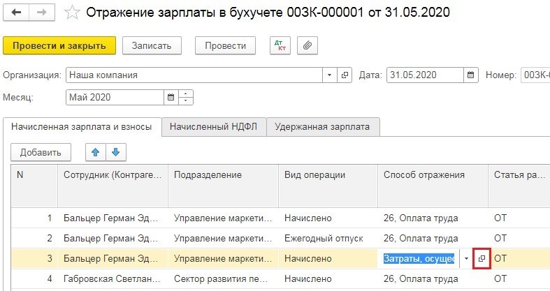 Чтобы откорректировать такое распределение, мы копируем строку сотрудника и добавляем в нее тот способ отражения в бухучете, который мы создали ранее.