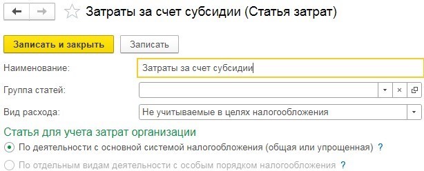 Откроется окно, в котором нужно «Создать» и ввести наименование «Затраты, осуществлённые за счёт субсидии». Затем «Записать и закрыть».