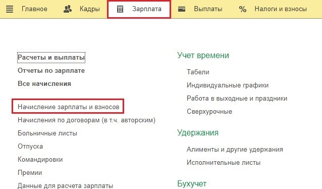 Чтобы произвести начисление зарплаты за месяц, в разделе «Зарплата» нужно выбрать «Начисление зарплаты и взносов».