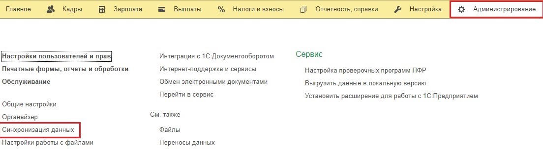 Все настройки выполнены? Тогда заходим в «Администрирование» и нажимаем «Синхронизация данных».