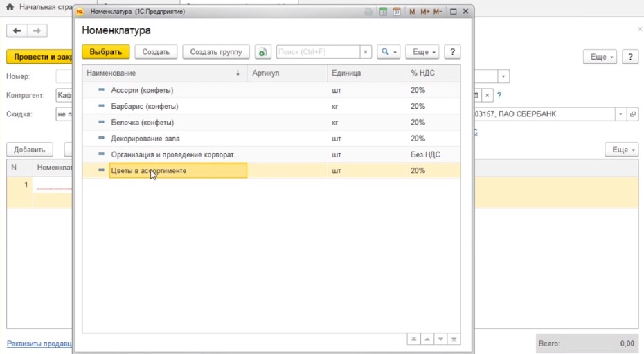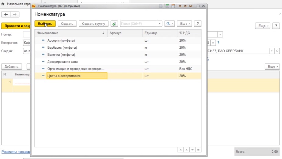 В справочнике номенклатуры выбираем необходимую нам номенклатуру. Например, цветы в ассортименте.