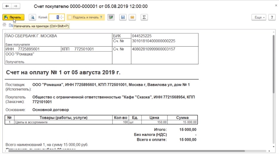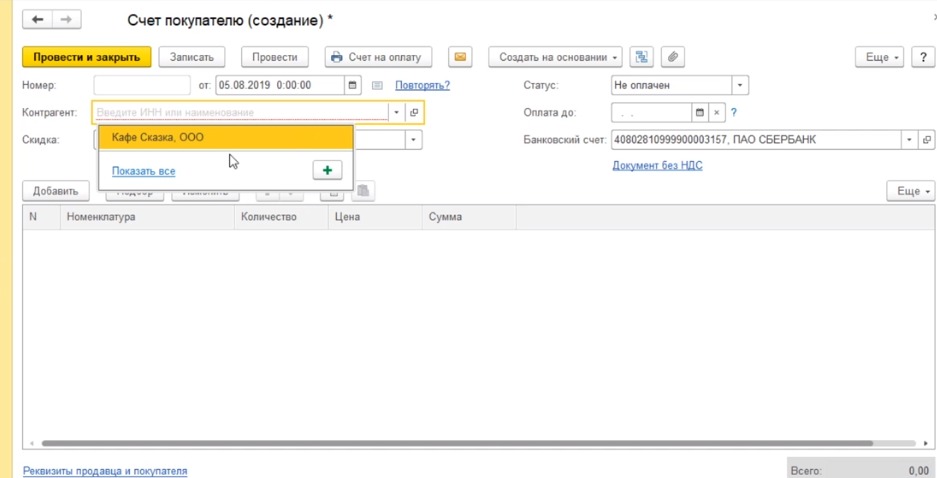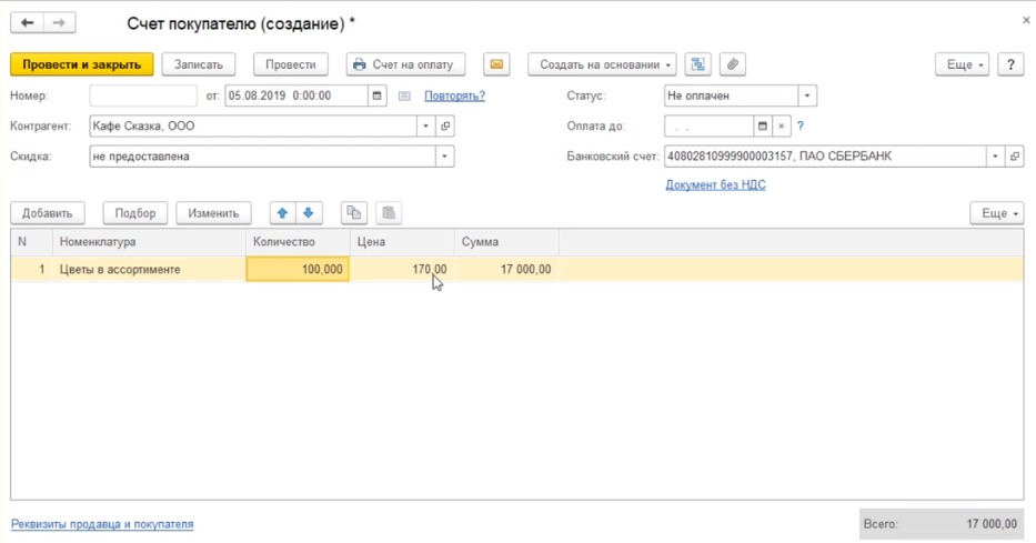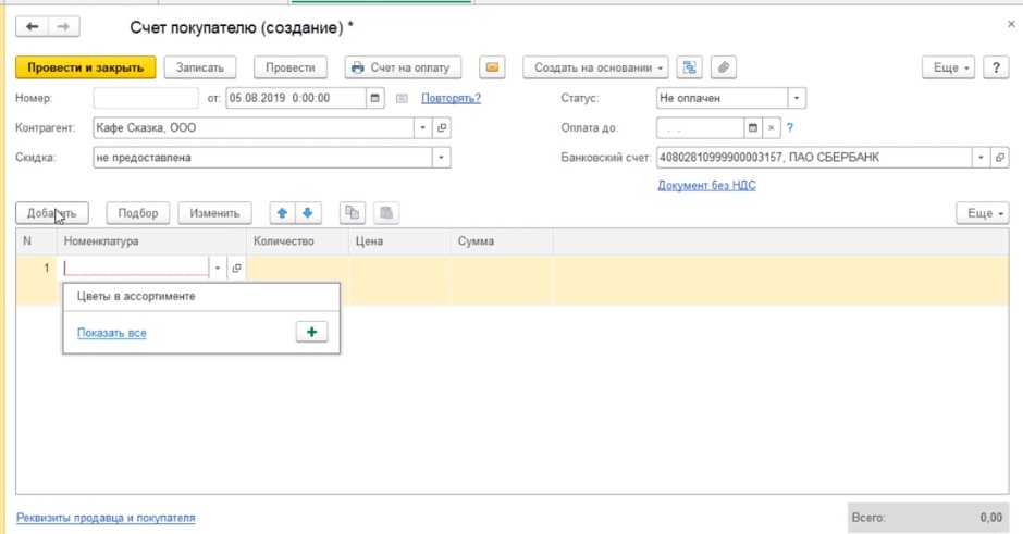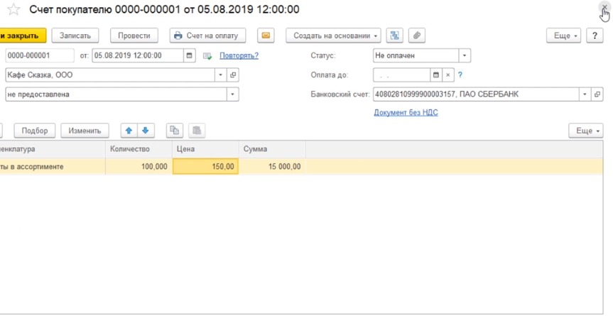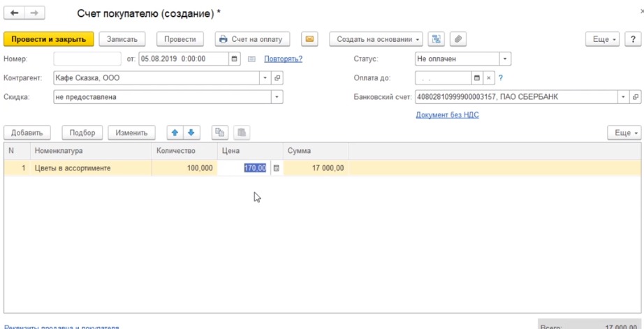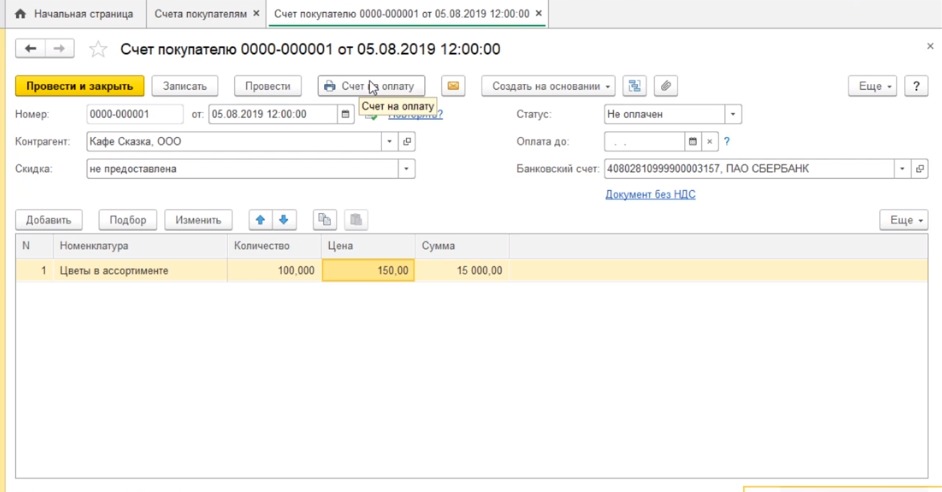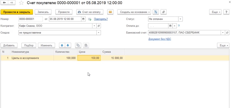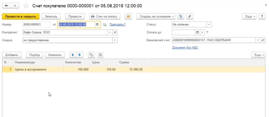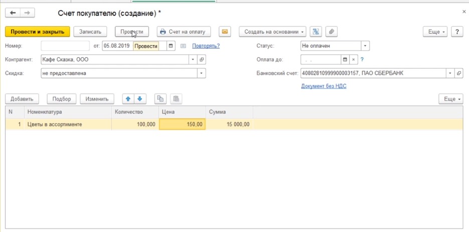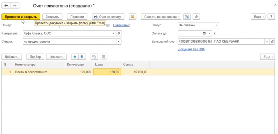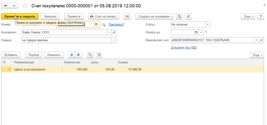 Далее сформировали документ - счет покупателя. Если мы более ничего не собираемся с этим счетом делать, то мы можем с помощью кнопки провести и закрыть - сохранить наш счет и закрыть форму для заполнения.