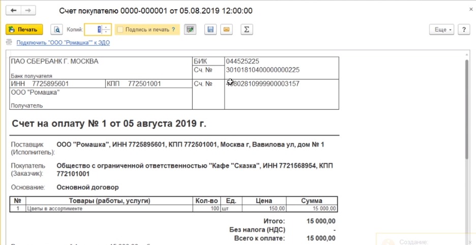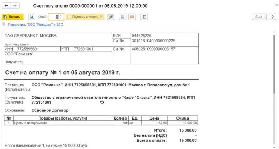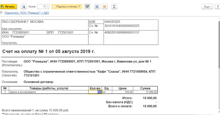 Сумму программа пересчитает автоматически. Для примера в качестве демонстрации выбрали организацию, которая находится на упрощенной системе налогообложения, поэтому в табличной части у нас никак не присутствует информация по НДС. Если ваша организация находится на общей системе налогообложения, то у вас появится еще одна дополнительная колонка, где будет указана ставка НДС и ставка НДС будет выбираться программой автоматически.