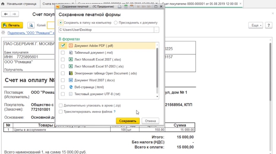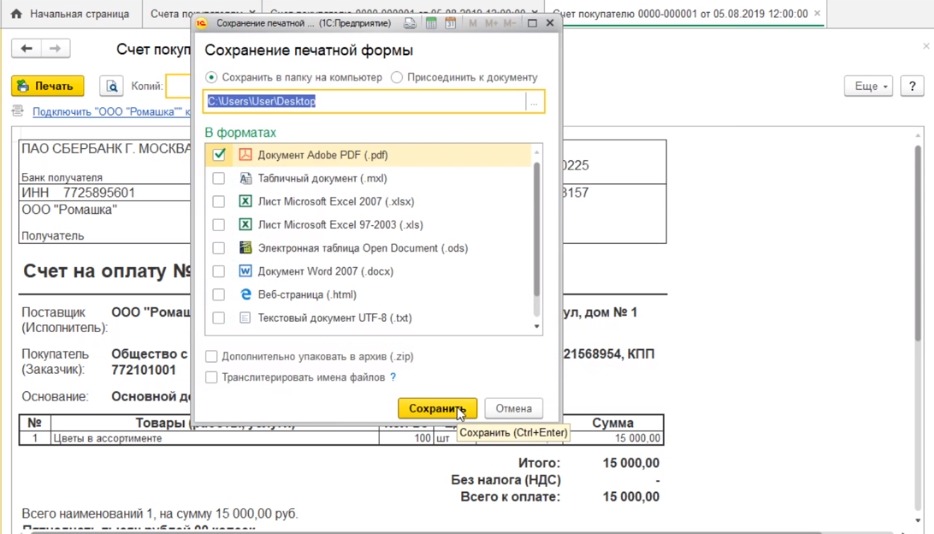 При нажатии на нее, программа предлагает выбрать в каком формате мы будем этот счет сохранять.