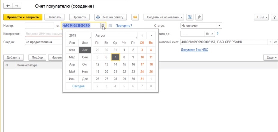 Дата документа. По умолчанию программа подставляет текущую дату на компьютере. Если нам нужно изменить эту дату, воспользуемся встроенным календариком и выбираем ту дату, которая должна быть, например, пятого августа.