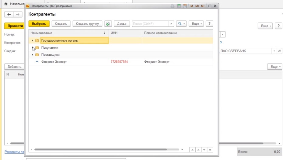 Мы попадаем в справочник наших контрагентов, где находим необходимого нам контрагента и выбираем соответственно его документ.