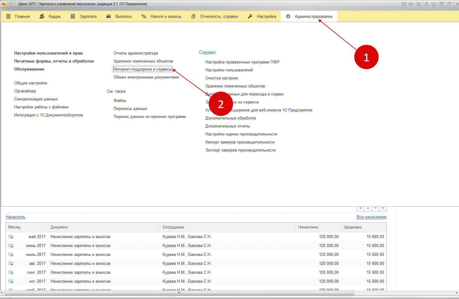 • войти в раздел «Администрирование» (1) и открыть вкладку «Интернет-поддержка и сервисы» (2);