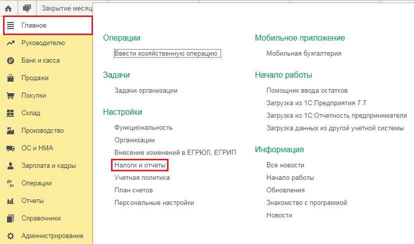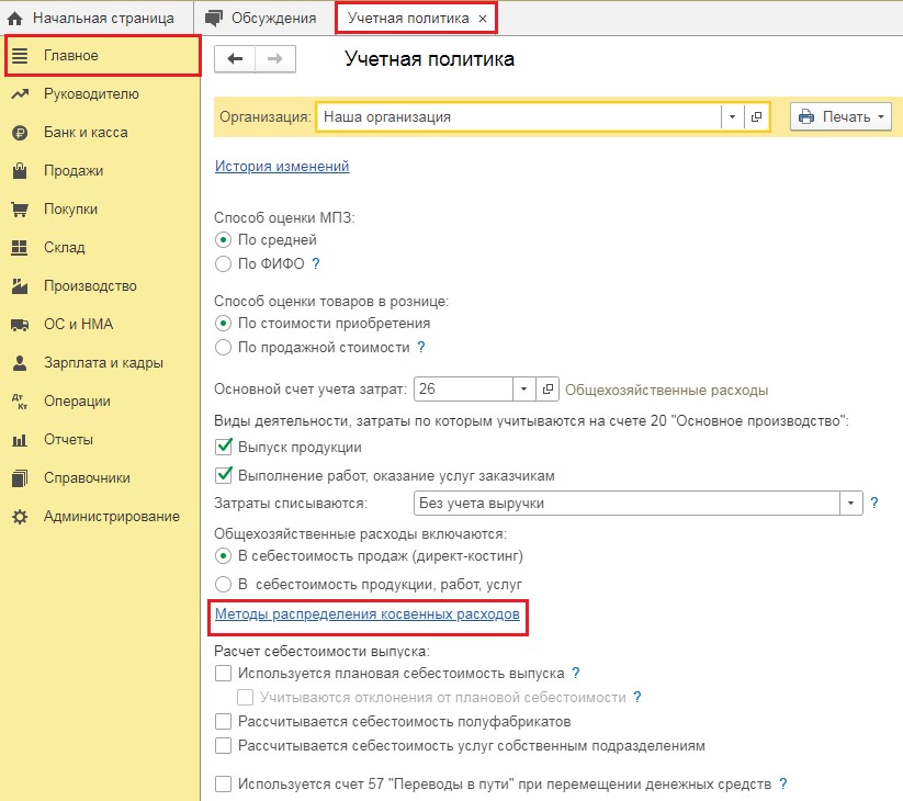 Настройка способов закрытия 26 счета расположена в «Учетной политике», соответствующий пункт можно найти в разделе «Главное».
